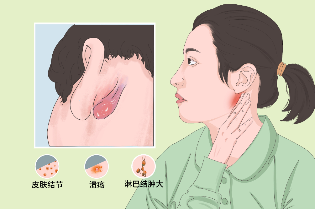 皮肤结节、溃疡、淋巴结肿大的典型症状。