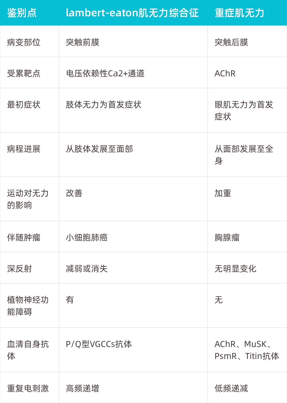 lambert-eaton肌无力综合征属于一种罕见的自身免疫神经-肌肉接头功能障碍性疾病,由小细胞肺癌等肿瘤或甲状腺功能亢进等自身免疫性疾病所引发,以大腿肌肉无力、上臂抬臂不能、自主神经功能障碍等为主要临床表现。本病可进行对症支持、免疫调节等治疗,一般伴随肿瘤者预后不良,非伴随肿瘤者预后良好。