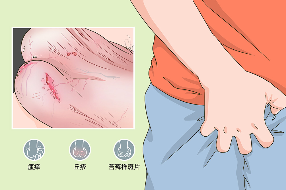 病初只是瘙痒,无任何原发性皮疹,伴灼热、虫爬、蚁走等感觉。患处常有抓痕、搓破、渗液、血痂等继发性损害,苔藓化边界不清楚。阴囊皮炎则因局部瘙痒抓破后,出现多角形的扁平丘疹融合成片,苔藓样变与正常皮肤界限清楚。