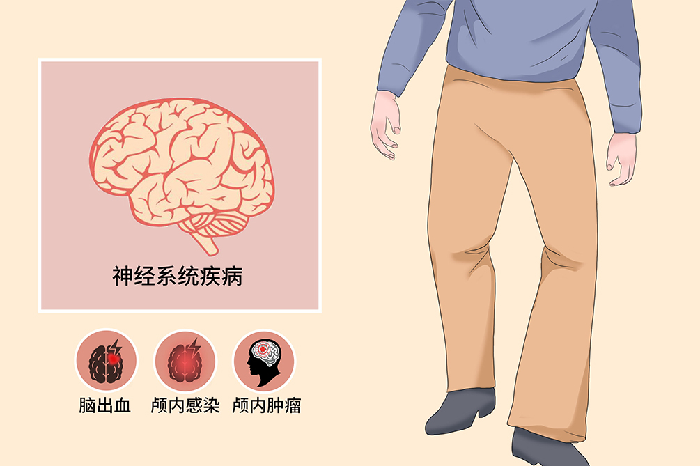 神经系统疾病,常见的有脑梗死、脑出血、颅内感染、颅内肿瘤、脑性偏瘫等,这些脑部病变损害了该侧的锥体束,引起对侧偏瘫,偏瘫侧肌张力增高程度在各肌群上不一致,上肢的屈肌比伸肌张力高,下肢的伸肌比屈肌张力高,从而导致偏瘫步态的发生。