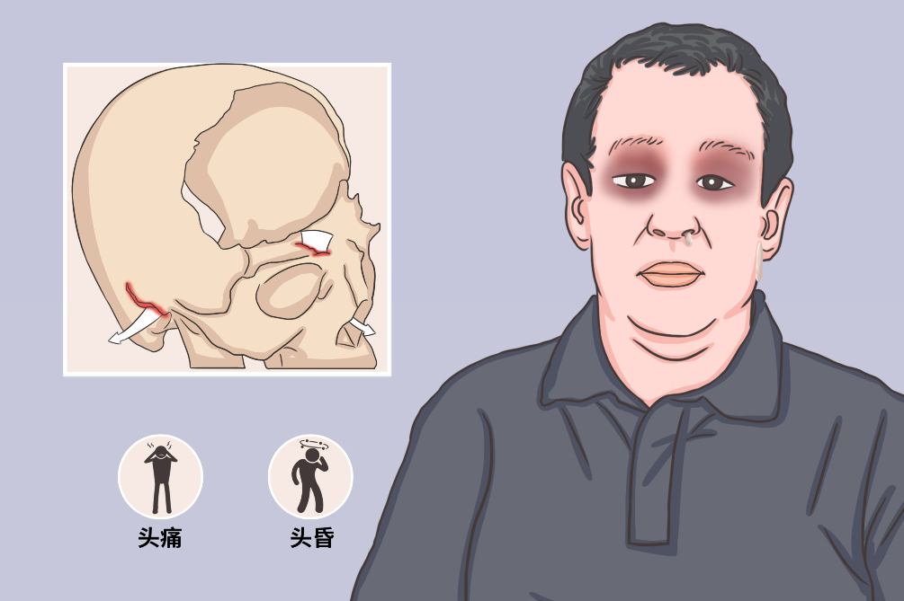 急性者伤后常有血性液体自鼻腔溢出、眼眶下淤血(俗称熊猫眼)、眼结膜下出血,可伴有嗅觉丧失或减退,偶有伤及视神经及动眼神经,出现相应症状。