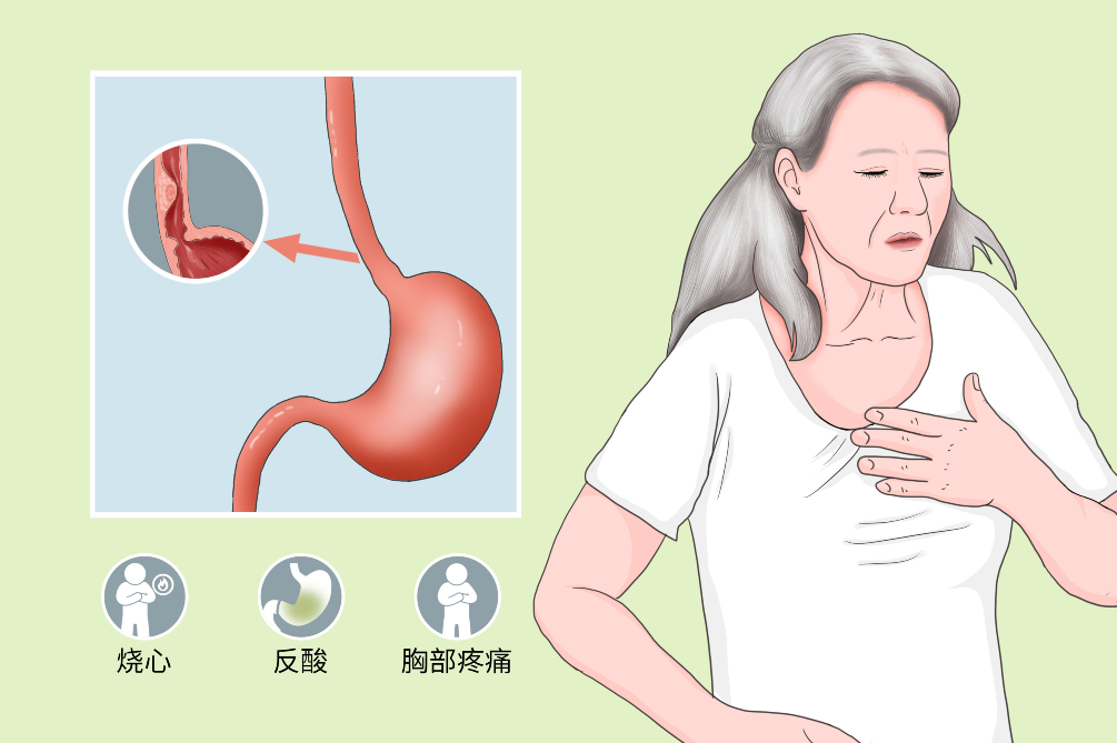 主要症状为非心源性胸骨后疼痛、吞咽困难、反酸、烧心、嗳气、呕吐,反流物误入呼吸道发生夜间阵发性呛咳、窒息及肺部感染等。