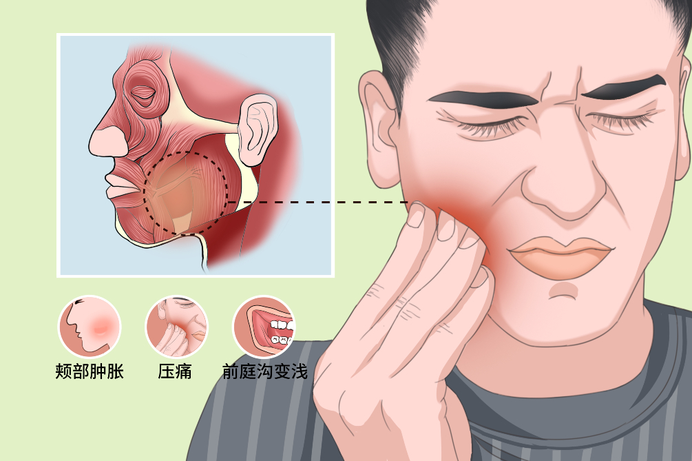 颊间隙主要症状是颊部肿胀,触之有压痛和波动感,前庭沟变浅或者消失,可伴随发热、头痛、全身乏力等表现。