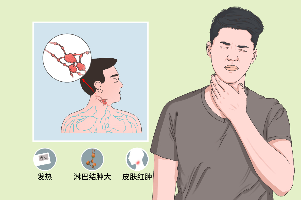 除淋巴结疼痛以外,还可以伴随淋巴结肿大、淋巴结周围皮肤红肿,甚至出现皮疹,有些病人还可发热。