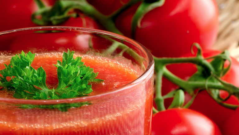番茄汁中除含有丰富的维生素、碱性元素、纤维素、果胶外,还富含番茄红素,番茄红素是较强的抗氧化剂,可改善老年性黄斑病变。番茄汁还含有多种有机酸,有机酸除了保护维他命C不被破坏以外,还可软化血管,促进钙、铁元素的吸收,帮助胃液消化脂肪和蛋白质。