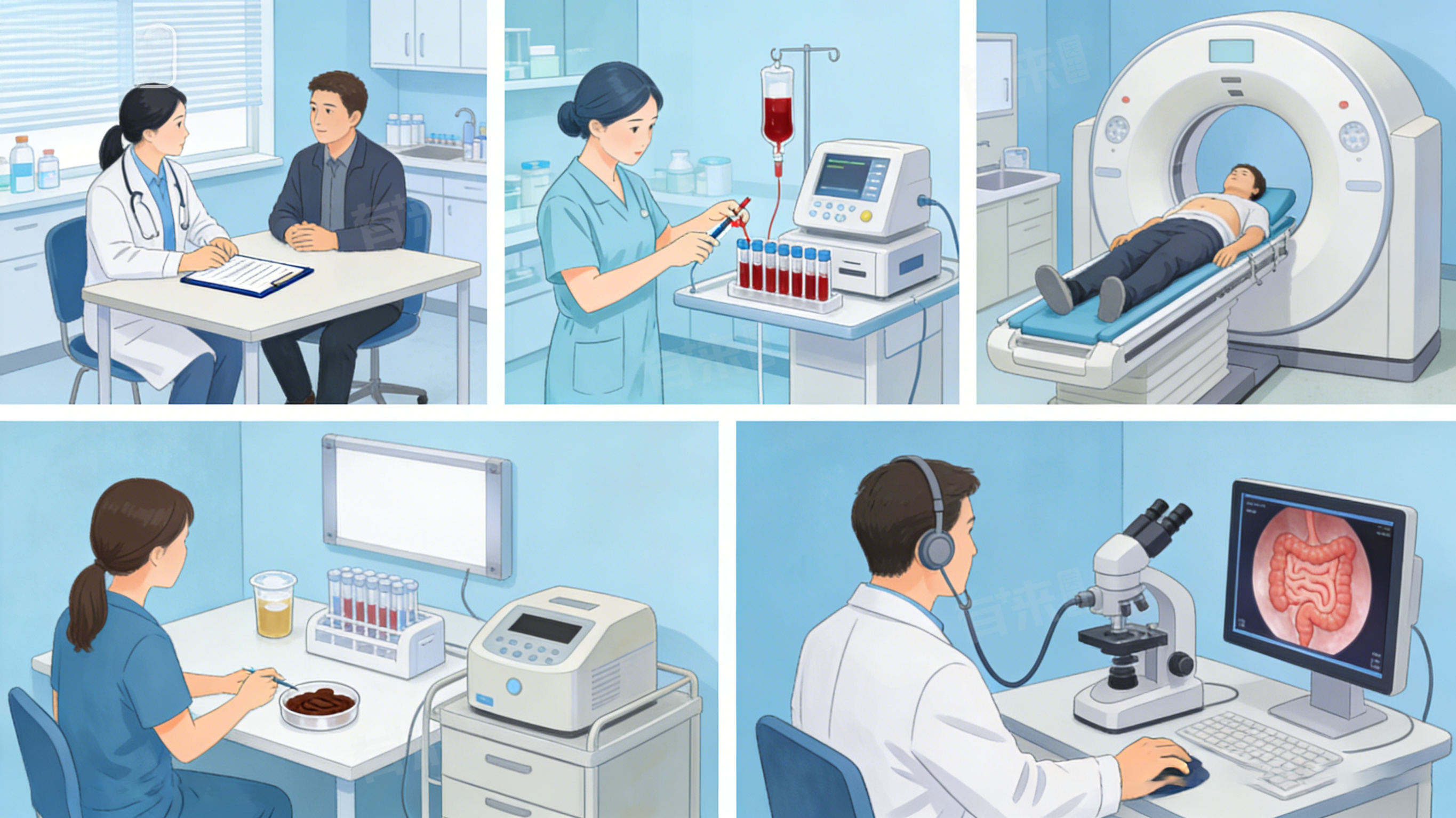 2、实验室检查:进行血常规、粪便常规、炎症指标检测,血常规可排查贫血,粪便常规可判断肠道是否存在感染、出血,炎症指标可反映肠道炎症程度。克罗恩病患者会出现白细胞升高、血沉增快、C反应蛋白升高,为确诊提供辅助依据。