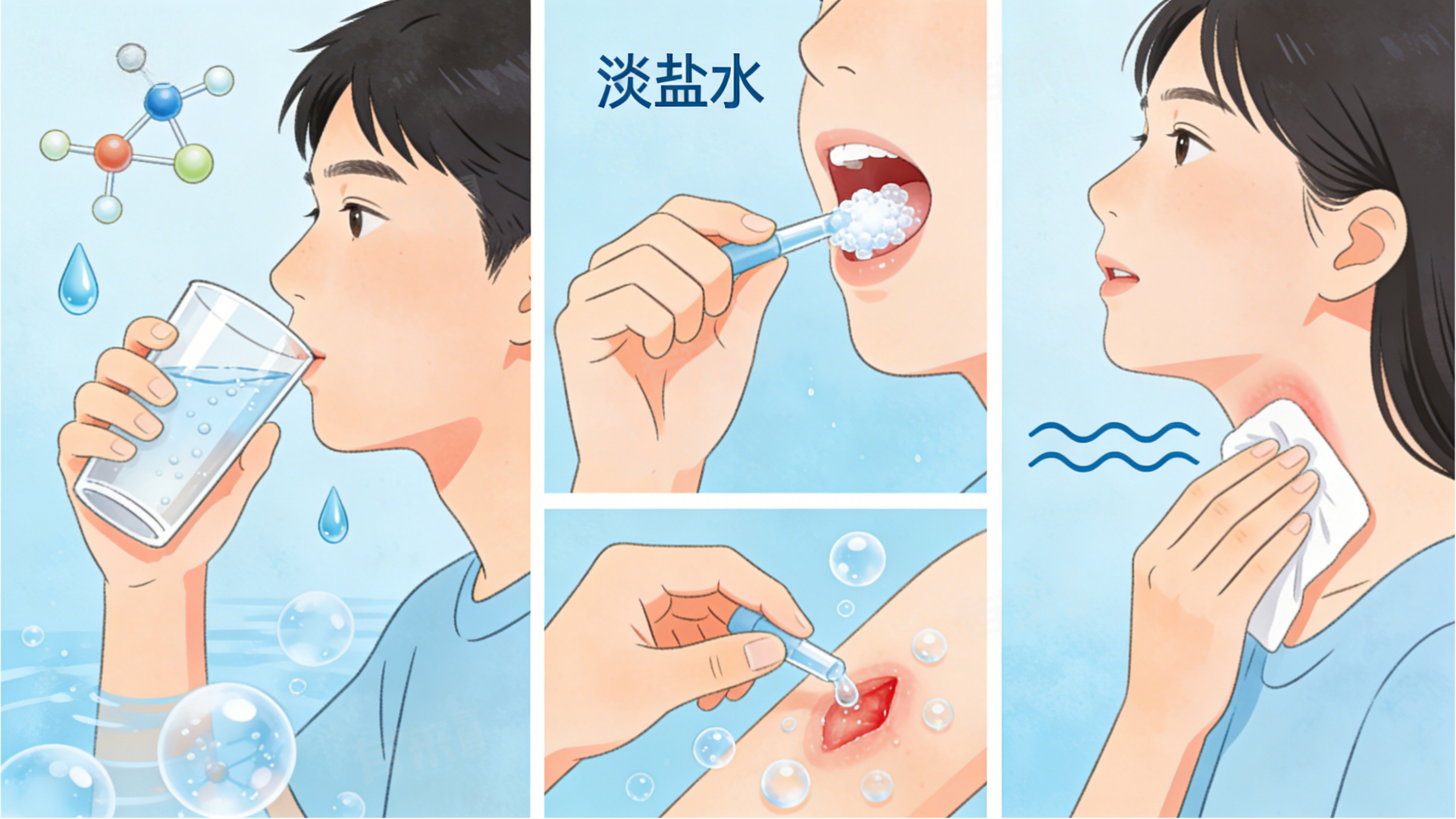 3、缓解咽喉轻微不适:咽喉出现轻微干燥、发痒时,饮用淡盐水或用淡盐水漱口,可湿润咽喉黏膜,减轻局部刺激,缓解不适症状,无需用药即可起到辅助调理作用,不适加重时需及时就医。