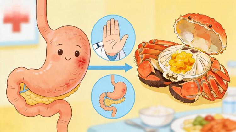 螃蟹属于寒性水产品,肉质中含有大量异体蛋白和胆固醇,这类物质难以被受损的肠胃消化吸收,还会刺激胃肠黏膜收缩,引发腹痛、腹胀、腹泻等症状加剧,加重肠胃负担。