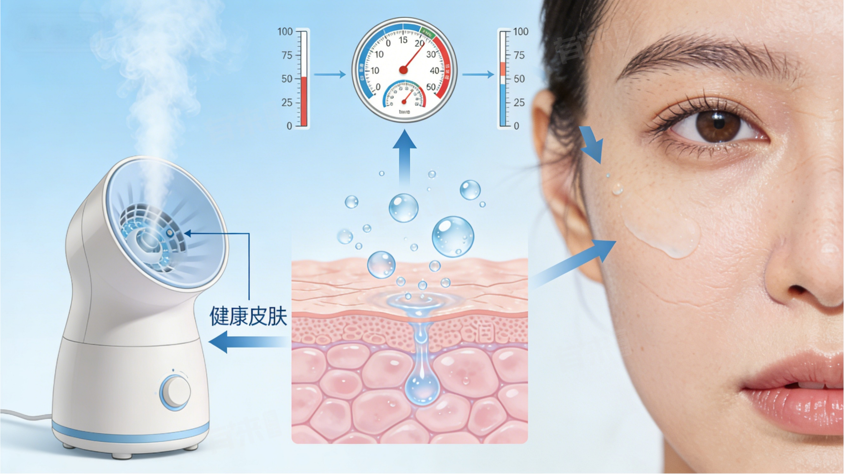 蒸脸器的核心作用是通过温热蒸汽打开皮肤毛孔,促进皮肤血液循环,帮助清洁毛孔内的污垢,同时补充皮肤表面水分,暂时缓解皮肤干燥。但这种作用是暂时性的,且过度使用会打破皮肤自身的生理平衡。