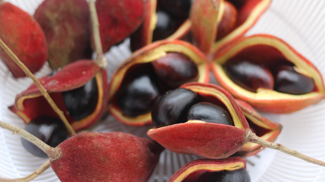 凤眼果是梧桐科常绿果树,它的果实不宜生食,必须煮熟才能入口,先剥外层的黑色种皮,再剥淡褐色半透明种皮,才吃得到淡黄种仁。