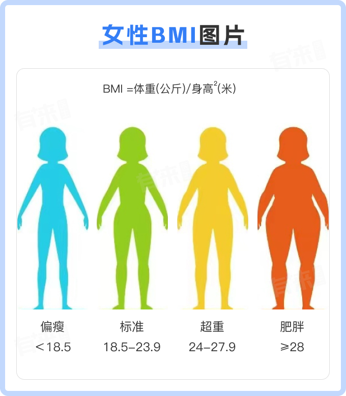 - 超重:BMI大于23.9kg/m^2且小于28kg/m^2,这类女性需要注意控制体重,避免进一步发展为肥胖。