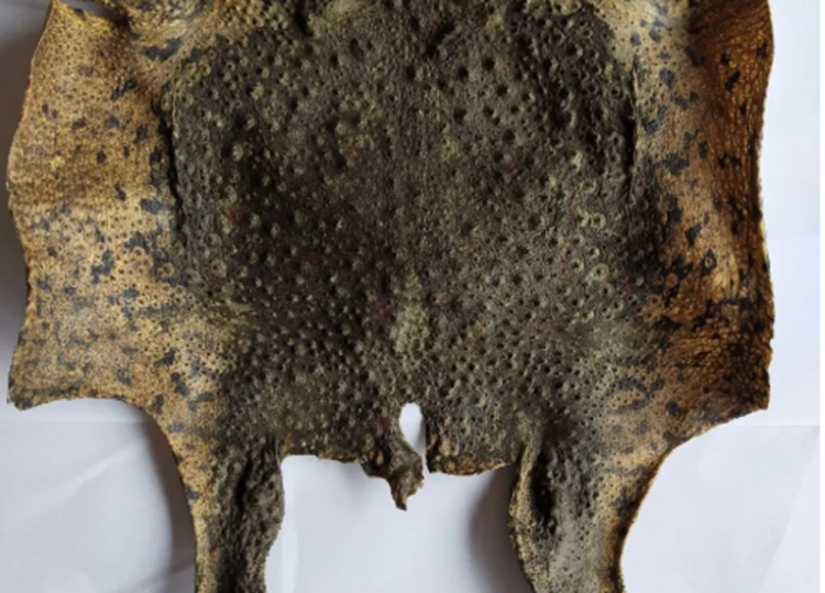 蟾蜍皮全体拘挛抽皱,纵面有棱角,四足伸缩不一。表面灰绿色或绿棕色,腹部棕黄色,密布黄棕色大小不等鼓起的圆形疣点。除去内脏,可见骨骼及皮膜,质坚韧,气腥,略具焦臭。